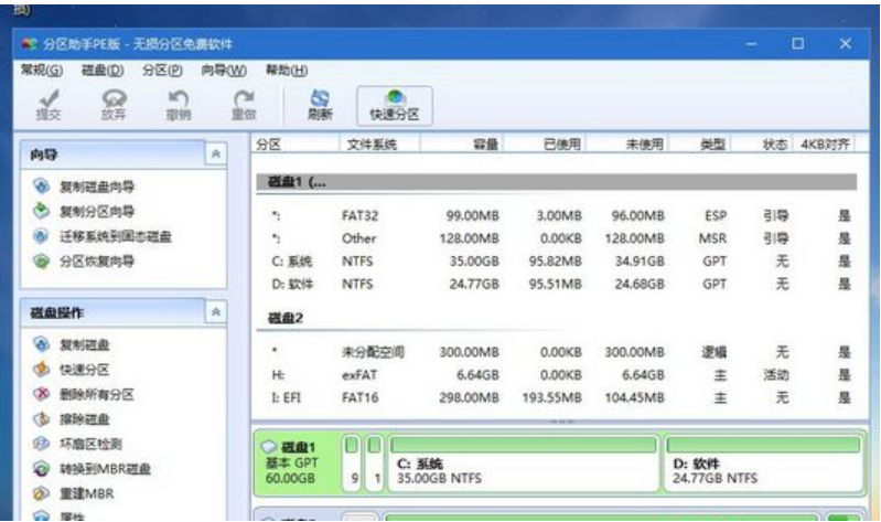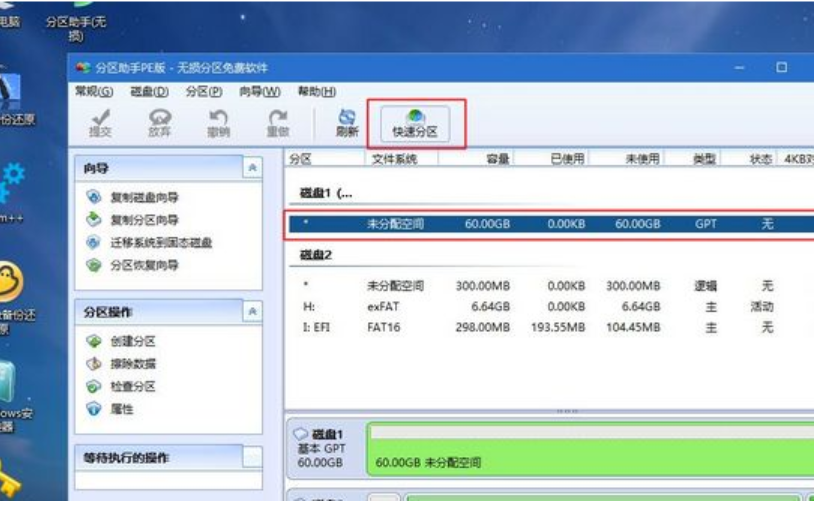 5、进入到pe系统之后,要在uefi下安装win10系统,硬盘需要GPT分区表,双击桌面上的【分区助手(无损)】,选择磁盘1,点击【快速分区】,如果多个硬盘,要选对,可以根据固态硬盘大小选择,注意不要误删。