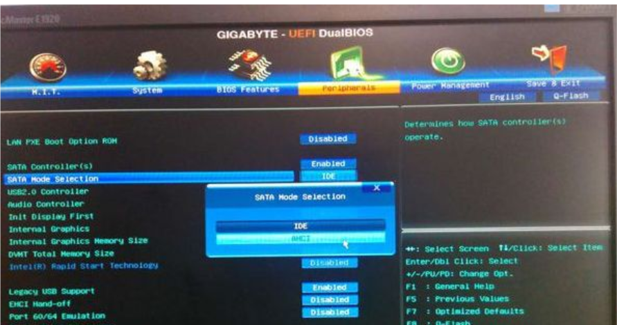 2、在电脑插入U盘,进BIOS开启硬盘AHCI模式,新型电脑默认就是ahci,不需要改,这一步可以省略。以技嘉主板为例子,启动电脑时按Del进入BIOS设置界面。切换到Peripherals界面,然后选择SATA Mode Selection回车,再选择AHCI回车,按F10保存重启电脑。