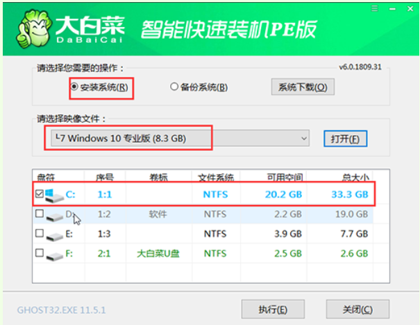 5、我们打开大白菜一键装机软件,选择“安装系统”,“映像文件”选择已下载的win10镜像系统,安装在“C盘”,点击“执行”进入下一步。