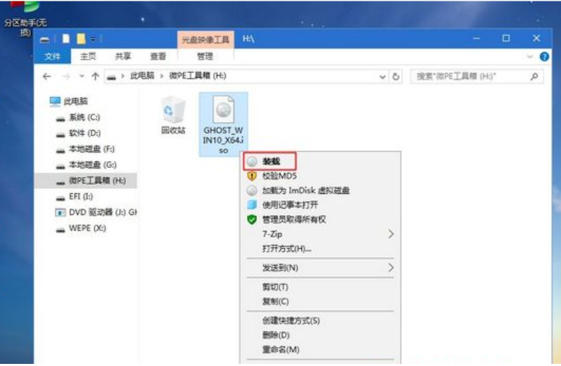 8、打开此电脑—微PE工具箱,右键点击win10系统iso镜像,然后选择【装载】,如果没有装载选项的话,可以右键—打开方式—资源管理器。