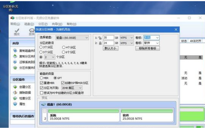 6、设置分区数目、大小还有分区类型,卷标为【系统】的系统盘建议60G以上,选择了UEFI启动,磁盘类型需要选择GPT,【分区对齐到】是4k对齐,2048扇区就行,也可以4096扇区,确认无误之后开始执行按钮。