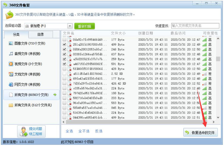 扫描完成后,我们选择需要恢复的数据,点击“恢复选中的文件”。