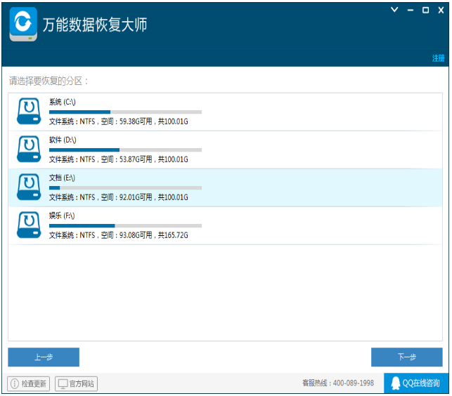 2、选择需要恢复的硬盘分区,(如果外接设备,请在运行软件前连接好),点击“下一步”开始扫描。