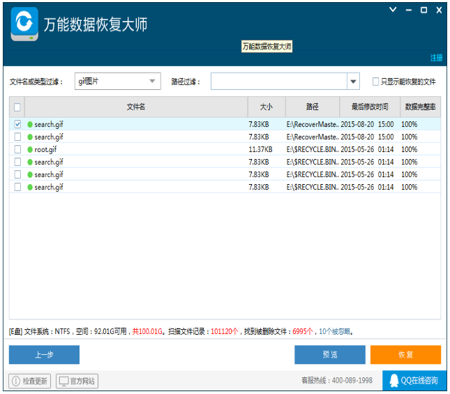 3、从扫描结果里搜索要恢复的文件,选择要恢复的文件,点击"恢复",等待完成即可。