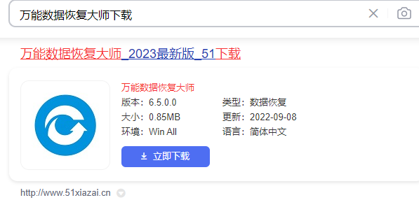 1、我们直接在电脑浏览器上输入查找“万能数据恢复大师”,即可找到免费版的下载站地址进入。
