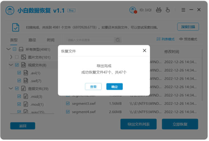 3、等待数据扫描完成后,选择需要恢复的文件类型,点击立即恢复。
