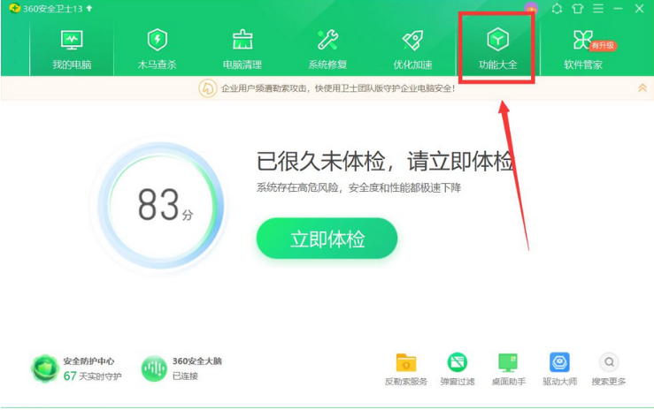 1、首先在电脑上安装并打开360安全卫士,打开软件后点击上方的“功能大全”。