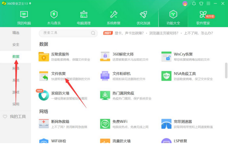 2、点击左侧的“数据”,选择其中的“文件恢复”点击添加,即可下载安装好360u盘数据恢复工具。