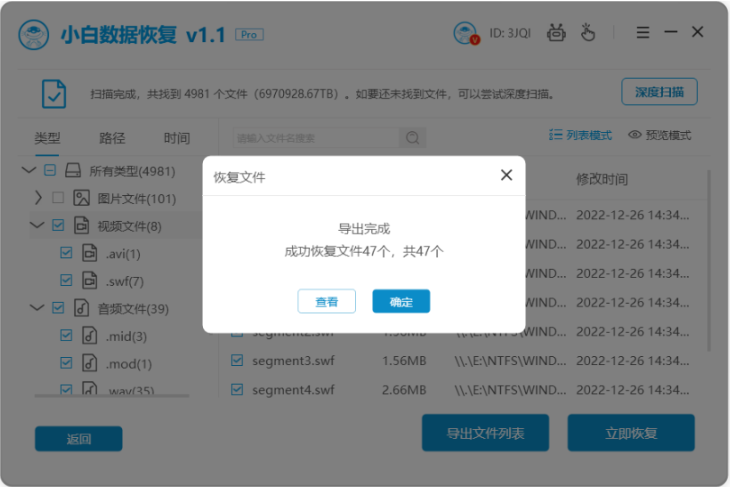 3、设置好需要保存的文件的位置,等待全部文件恢复完毕,点击查看就可以去查看已经恢复的文件。