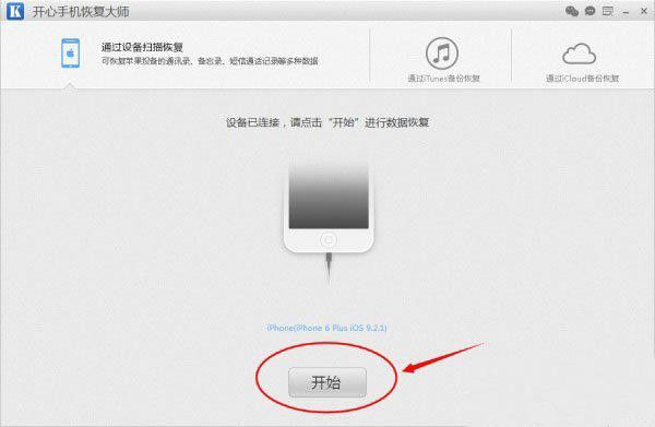 1、开心数据恢复大师备份数据方法,首先打开开心恢复大师,将手机连接至电脑,选择【通过设备扫描恢复】并点击【开始】按钮,跳转进入通过设备扫描模式。