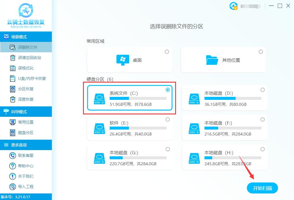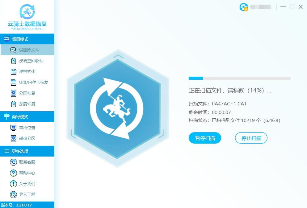 1、以云骑士数据恢复软件为例,打开软件操作界面,点击场景模式,根据需要选择丢失情况,这里选择误删除文件。