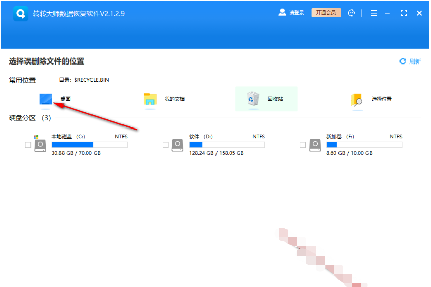 2、进入之后,在该页面需要选择一个自己想要恢复文件的位置,比如这里选择恢复【桌面】删除的文件,然后点击【开始扫描】。