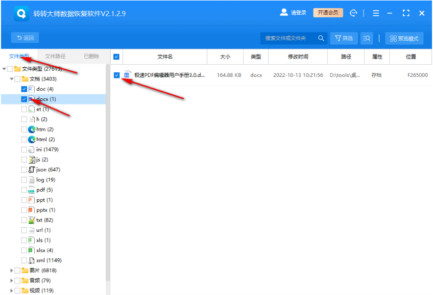 3、在扫描页面中,当所有文件都扫描出来之后,在左侧可以有三种选项选择文件,首先可以选择【文件类型】,在下方勾选自己想要恢复的文件类型,然后在右侧就会自动勾选所选的文件类型。