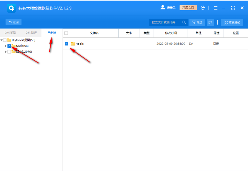 5、然后在【已删除】选项卡,你可以勾选删除的文件夹,然后在右侧也会自动勾选该文件夹中的文件。