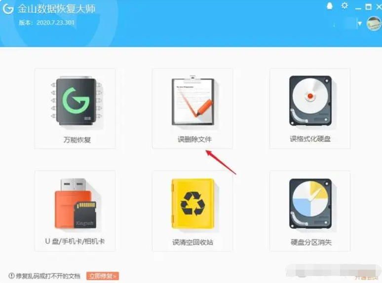 1、启动金山数据恢复大师主界面,选择对应的恢复功能,这里单击“误删除文件”选项。