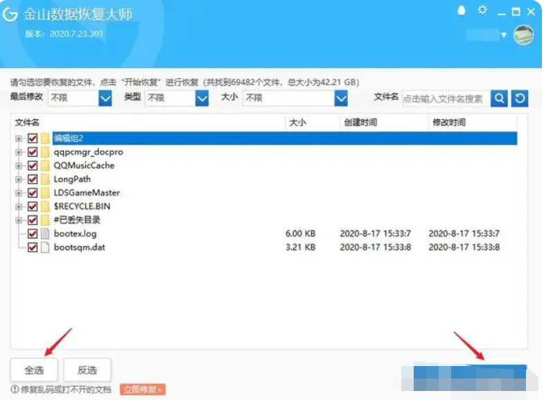 3、等待软件扫描完毕后,将文件全选上,单击右下角的“开始恢复”选项。