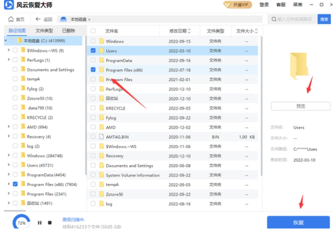 2、耐心等待扫描完成后在左边会显全部的文件信息,找到自己需要恢复的文件进行勾选,然后鼠标点击“恢复”等待恢复完成即可(ps:不要将还原回来的资料保存到硬盘,以免原始资料被覆盖,提升恢复难度。