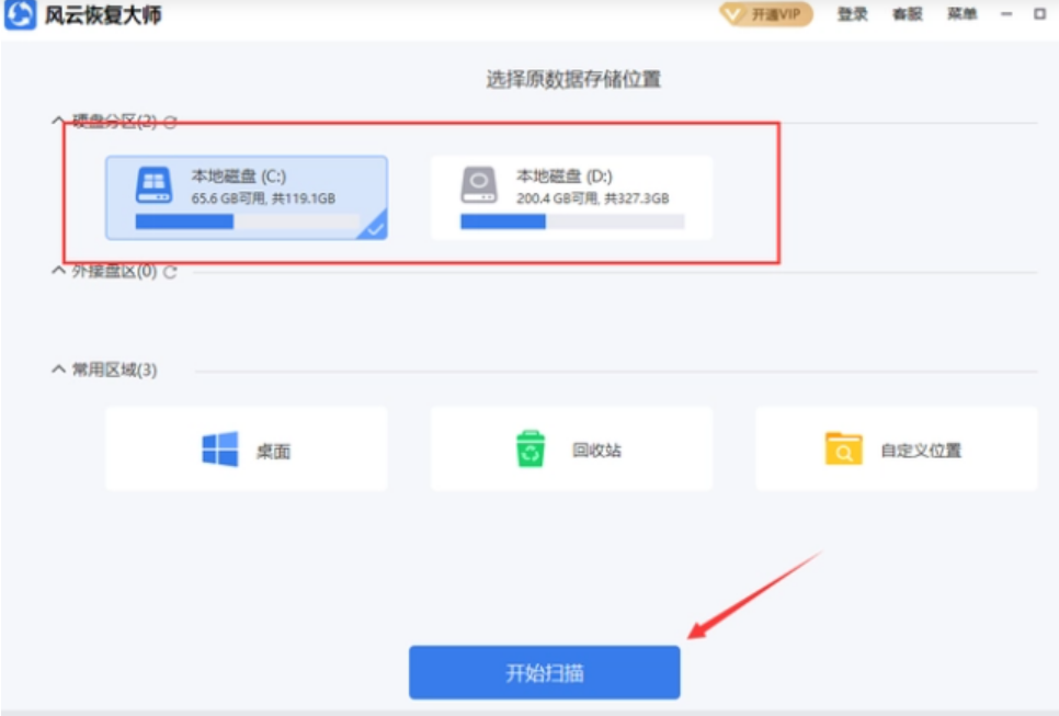 1、在电脑上下载并安装“风云恢复大师”软件并双击打开运行,在硬盘分区找到文件丢失的位置,接着鼠标点击“开始扫描”。