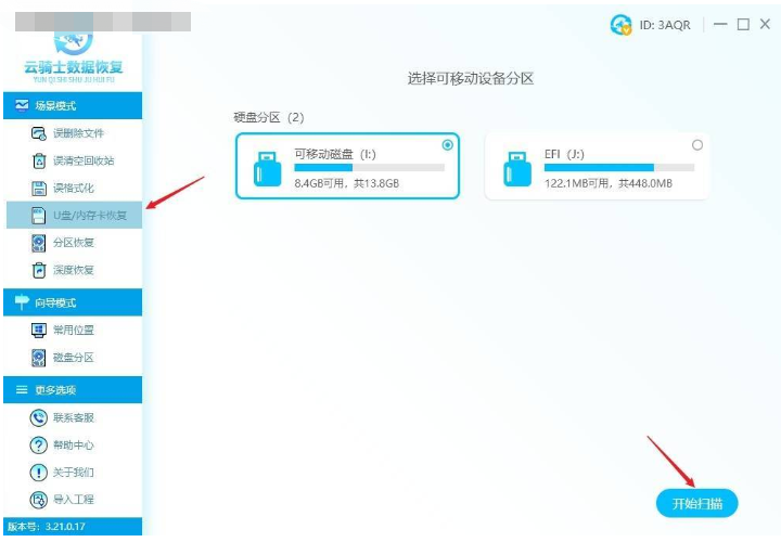 2、然后在【场景模式】下选择【U盘/内存卡恢复】,选择格式化的u盘,单击【开始扫描】。