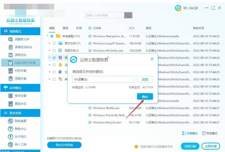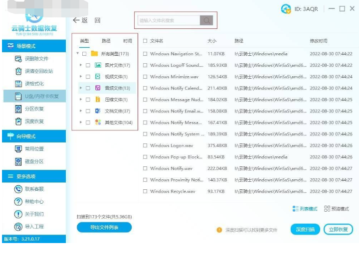 3、文件扫描工作结束后,在文件类型、文件大小、文件名等方式下找到我们的所需文件。