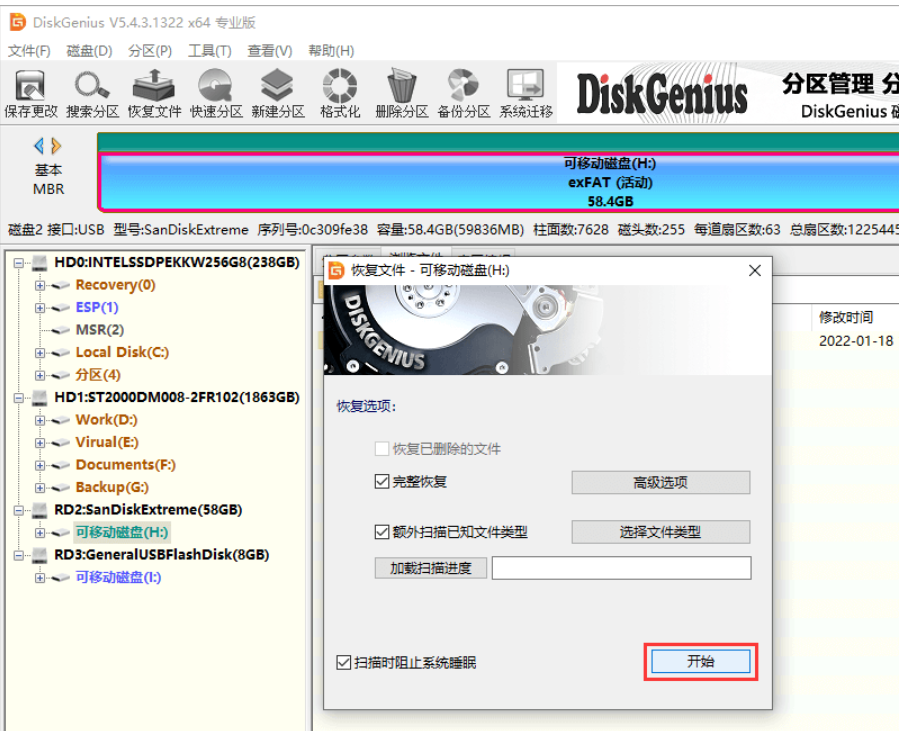 3、选择恢复模式,点击“开始”按钮。点击"开始"按钮后,软件将会开始对丢失数据的分区进行完整深度的扫描,如果需要扫描的空间不是很大,扫描很快就会完成。