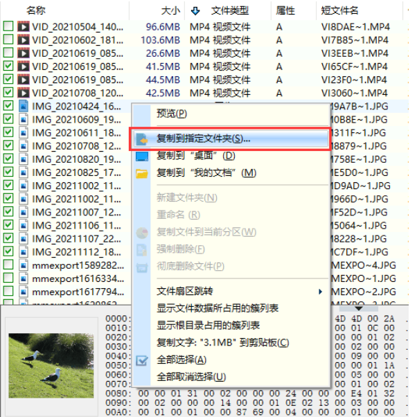 5、在扫描结果中我们挑选自己需要恢复的数据,右击选中的文件并选择"复制到指定文件夹"选项,根据软件提示在电脑硬盘或是其他设备上设置文件夹来保存恢复的数据。