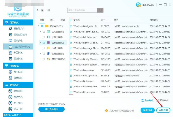 4、将需要恢复的文件勾选上,点击右下角的【立即恢复】,另存到电脑其他磁盘中。