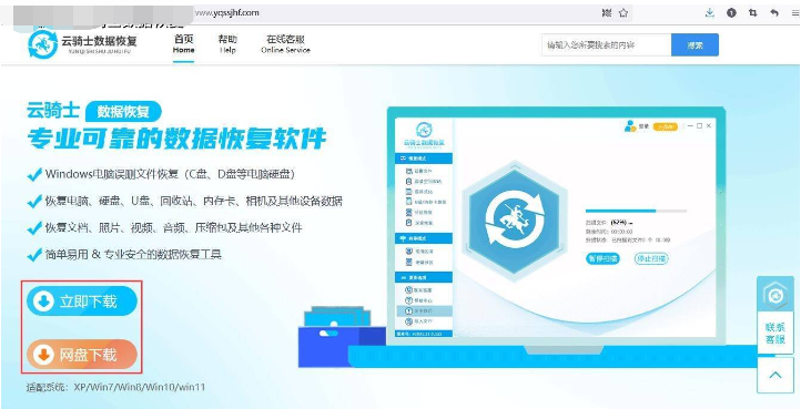 1、我们将U盘插入电脑接口中,到官网下载U盘文件恢复软件——云骑士数据恢复软件,并在电脑中安装运行。