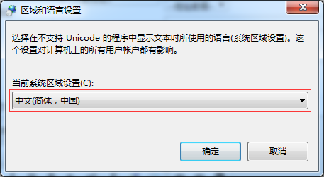 4、在弹出的“区域和语言设置”窗口中,把“非Unicode程序中所使用的当前语言”更改为“中文(简体,中国)”,点击“确定”即可关闭窗口。如果已经是“简体中文”,可以先改为其它的语言,然后再改回“简体中文”,就可以修复中文显示乱码的问题了。