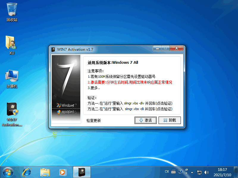 1、百度搜索 WIN7 Activation,在一些常规的下载网站中有提供下载链接,下载后退出电脑上的安全软件,然后打开选择激活即可。激活成功后选择立即重启,然后您就会发现 Windows 7 右下角就没有该水印选项了。