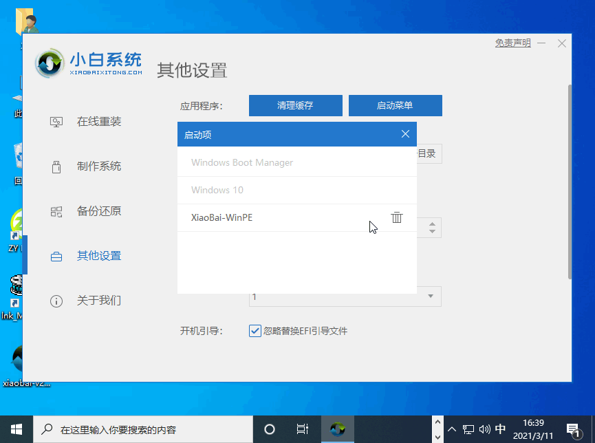 正常选择系统进入后,您可以直接打开小白一键重装系统软件,在软件的其它设置选项中有个启动菜单,在这里您可以找到需要删除的开机引导菜单删除即可。
