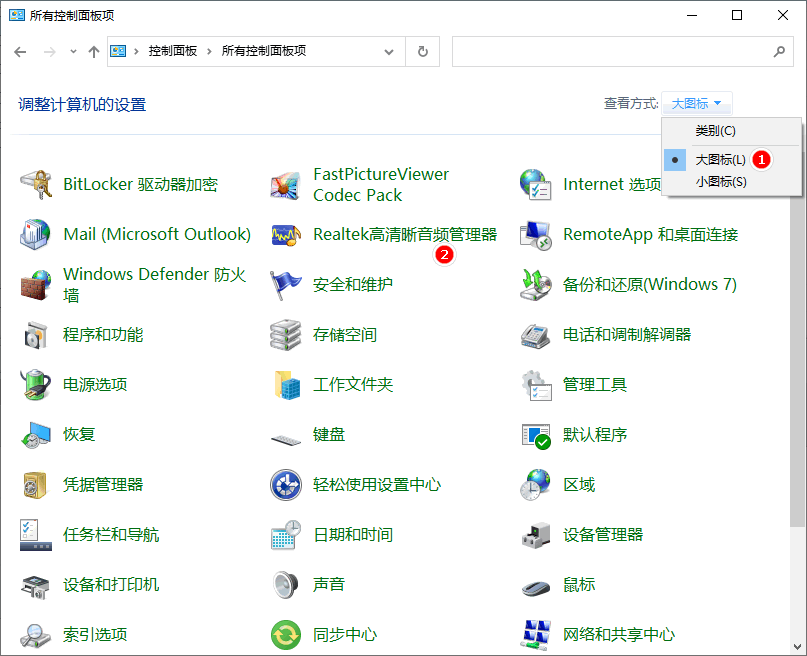 1、在 Windows 搜索中输入控制面板并打开 Windows 控制面板选项。在选项中找到查看方式,更改为大图标,然后在面板中找到 Realtek 高清晰音频管理器 并打开,如图。
