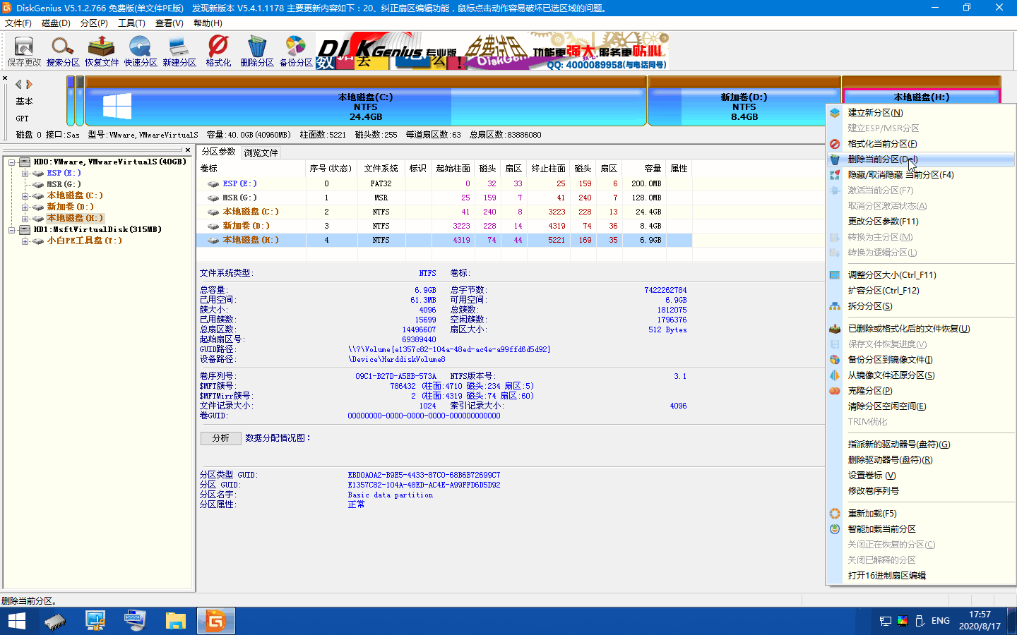 2、选择当前 H 盘,右键,删除掉当前分区。如果该分区中有重要资料,可以先拷贝走。删除完分区后不要点击左上角的保存更改。
