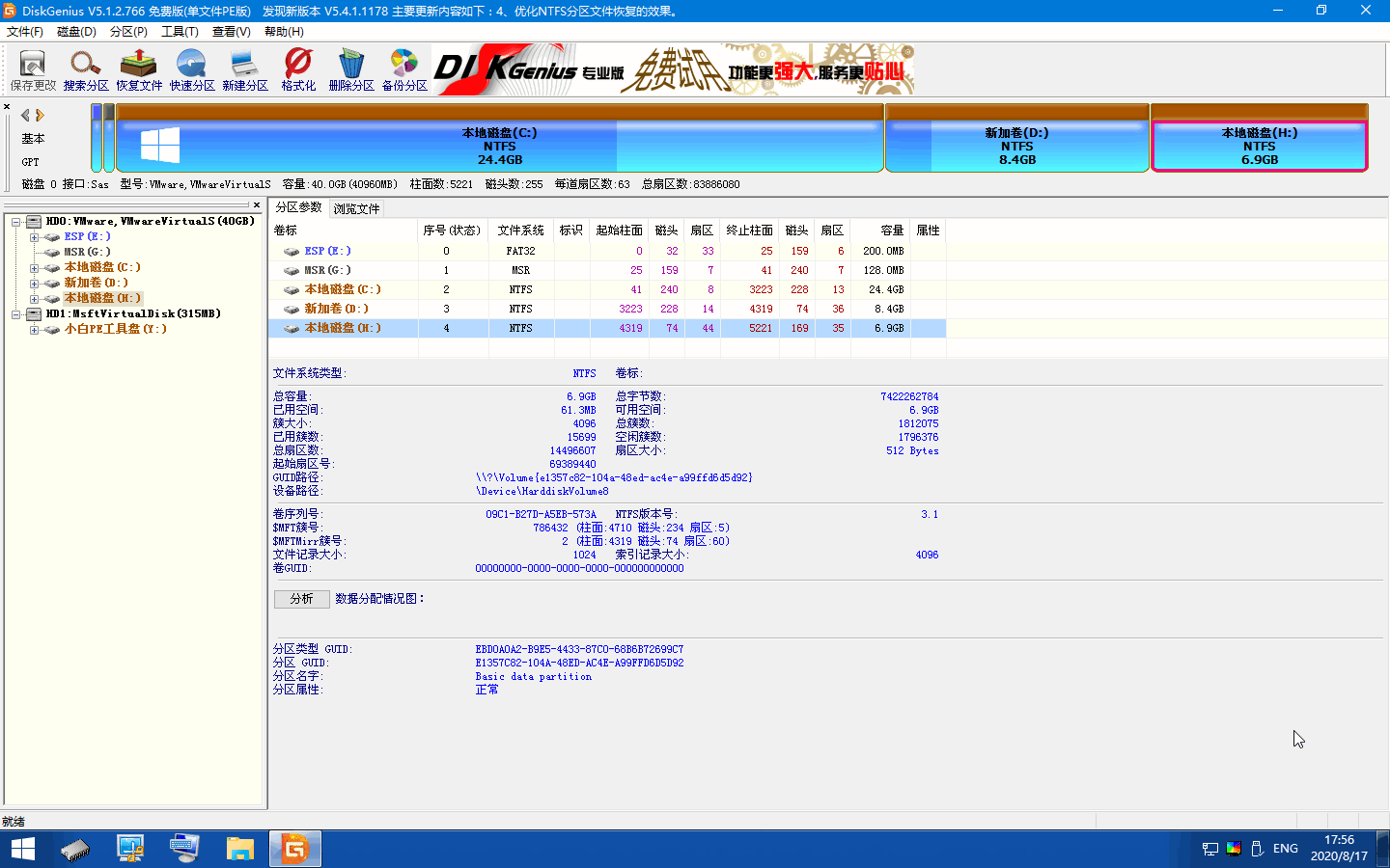 1、无论是在 PE 系统还是在 Windows 系统中,百度搜索 DiskGenius 分区工具并下载,打开后您可以在左侧看到当前电脑硬盘分区。当前电脑硬盘分区中我想把 H 盘和 D 盘进行合并。