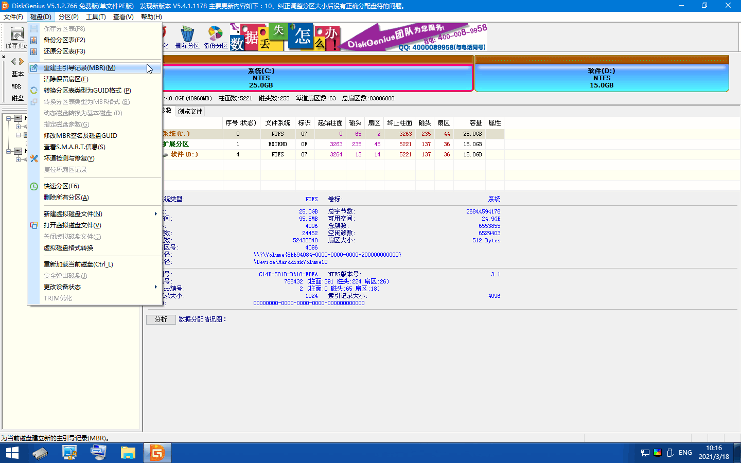 3、为了再安全一些,我们选择 C 盘后,可以通过点击硬盘菜单中的重建主引导记录(MBR)然后确定即可。