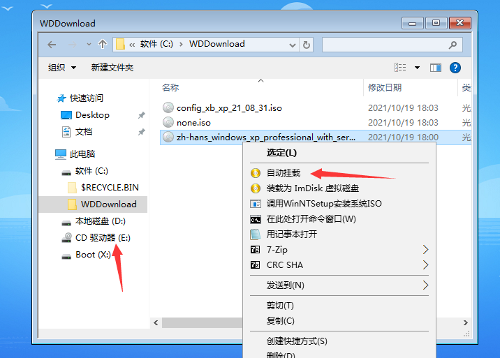 在 U 盘或硬盘分区中找到 Windows XP 镜像,右键,选择自动挂载。挂载后会在此电脑下方增加一个新的分区。