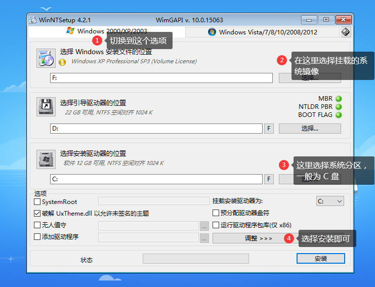 打开 WinNTSetup 工具,选择左侧选项,根据图片上的步骤来选择设置,没有指示的不需要设置进行调整。