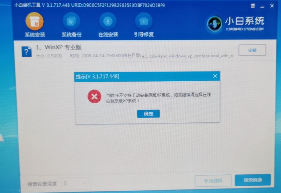 有用户在使用小白装机工具进入 Windows 2003PE 系统后在使用装机大师安装 Windows XP 时提示:当前PE不支持手动安装原版XP系统,如果需要继续请选择在线安装原版XP系统!从而导致无法继续安装,我们可以通过以下方法来解决。