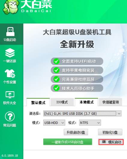 5、完成后,点击模拟启动,如图所示的界面意味着U盘启动盘的制作已成功完成。