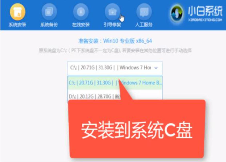 8、选择C盘,点击开始安装。等待win10系统安装完成后,拔出U盘,重启电脑我们的win10系统就安装好啦。