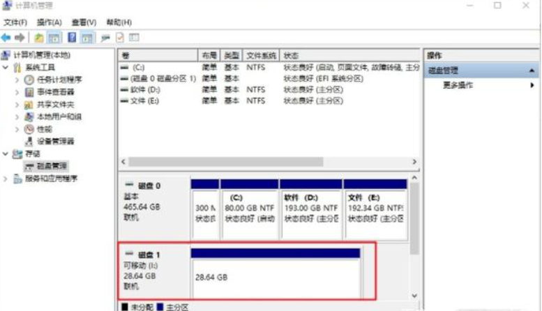 4、打开“磁盘管理”打开,确认好u盘的盘号。(如图所示是1盘)。
