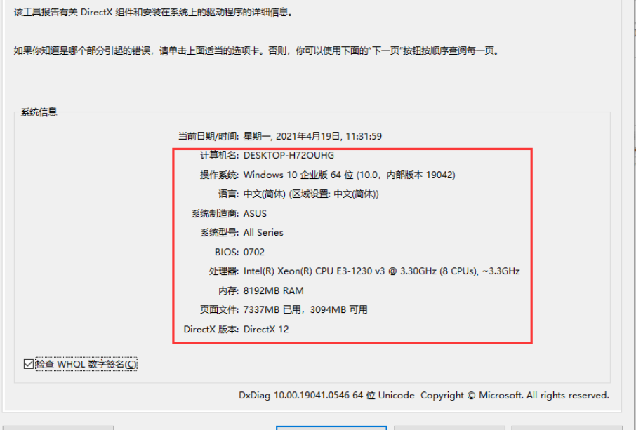 2、在出来的DirectX诊断工具下面找到操作系统,即可看到Windows版本。