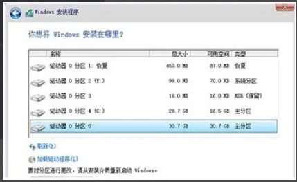 4、将win10系统安装在主分区内,选择大于30G,下面的步骤根据提示操作就可以使用更新好的win10系统了。