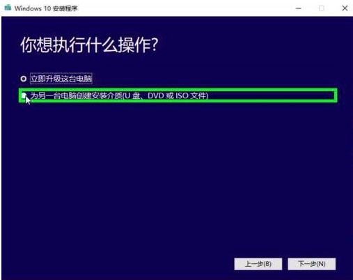 4、此时有两个选项,根据自身需求选择不同选项,小编在这里选择“为另一台电脑创建安装介质(U盘、DVD或ISO文件)”,选择完成后点击下一步。