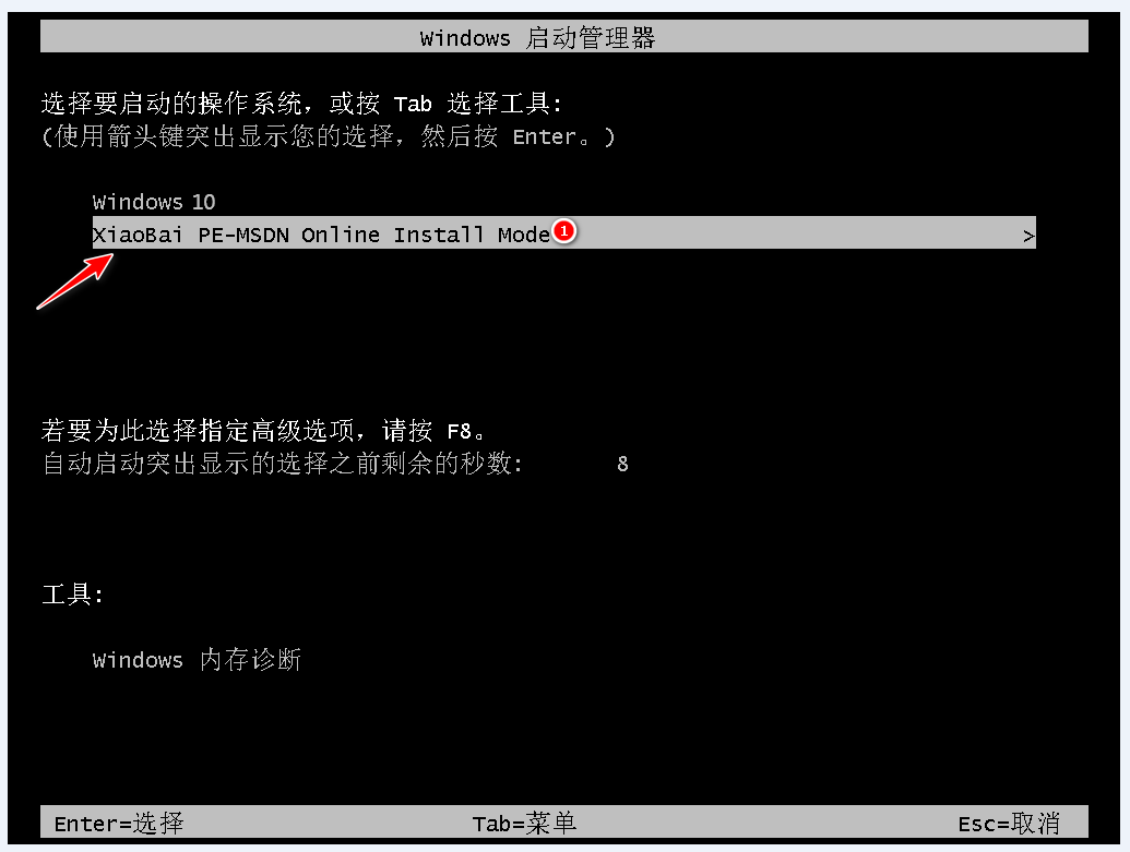 4、电脑重启后进入了启动页面,选择进入xiaobai-pe系统。