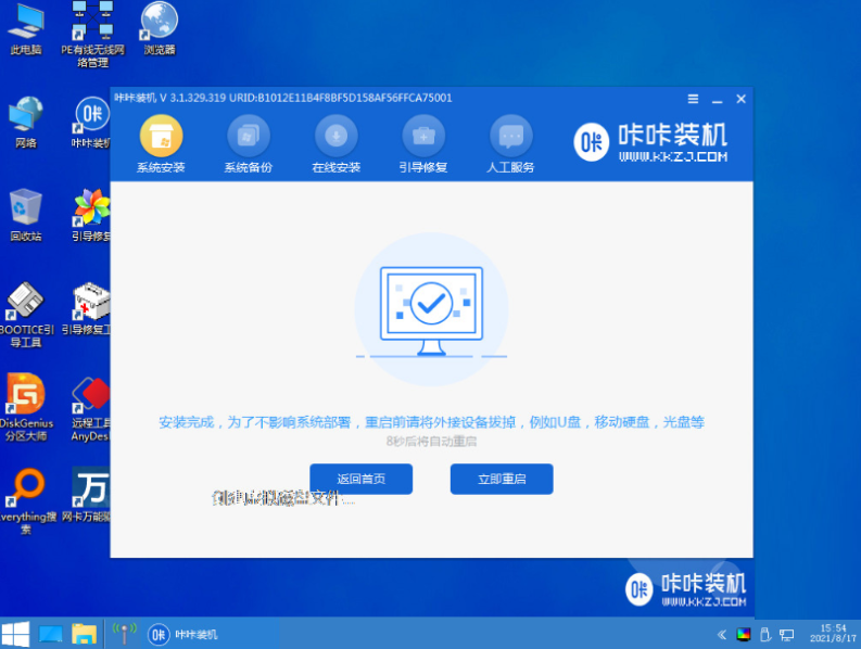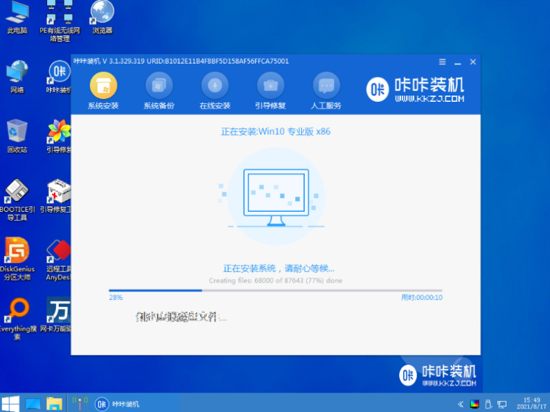 5.进入pe后,咔咔装机工具会自动打开安装win10系统。