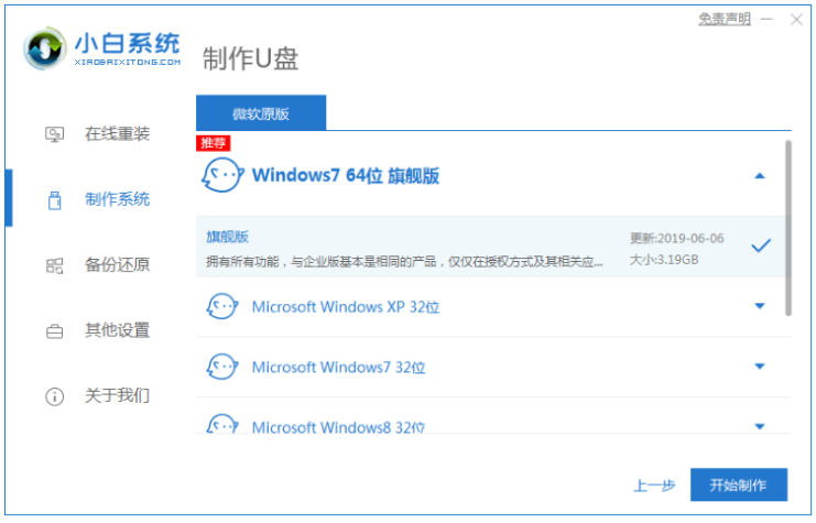 1、小白一键重装系统软件u盘重装win10步骤,首先插入U盘到电脑,点击打开小白U盘启动盘制作工具,选择“制作系统“,在制作系统界面中,这里选择制作 U 盘,在选择 U 盘中选择您的 U 盘,其它参数默认,鼠标点击开始制作。