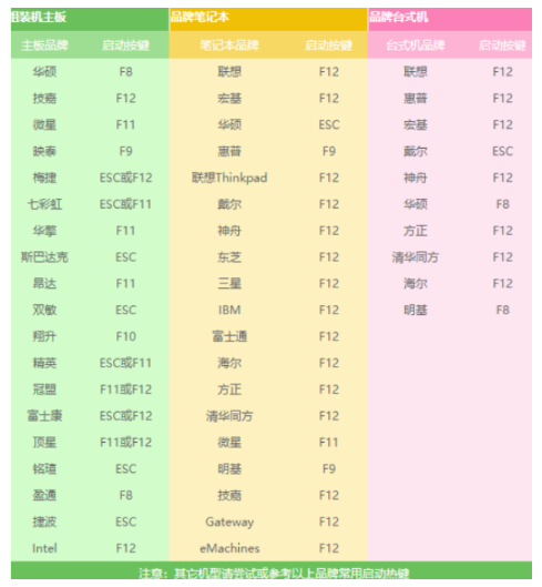 5、重启电脑,开机时要快速按热键进入 Bios 或者快速引导菜单的界面,进入后使用方向键选择U盘选项。U盘启动快捷键一般为 F12,有些可能是 Esc、Del、F2 之类的。具体大家可以参考如下图所示。