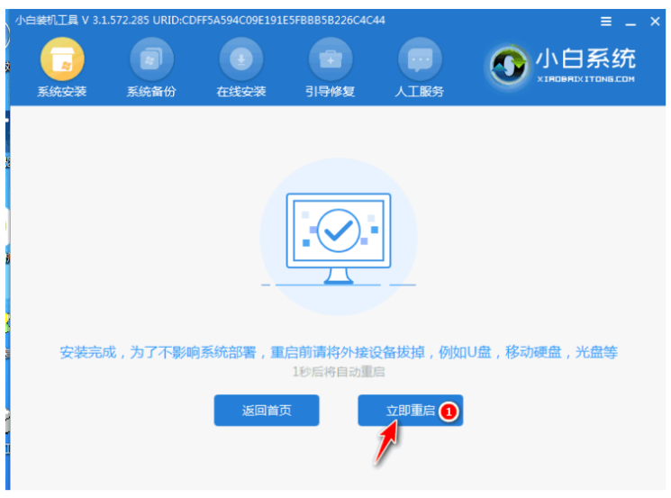 7、装机工具会自动完成安装,选择立即重启电脑。