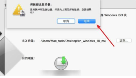 4、在弹出的选项框中点击继续,进入到镜像刻录到U盘环节。